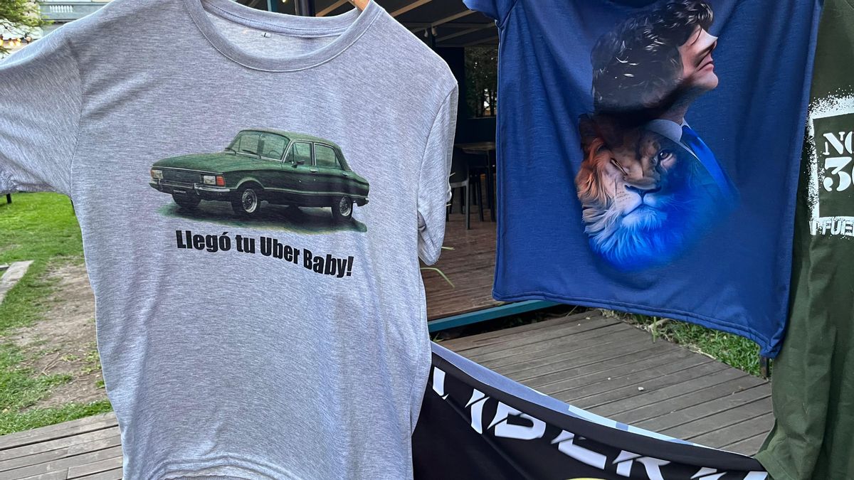 Junto a las remeras ($30.000), en la feria libertaria que funcionaba como antesala del salón de conferencia, y junto a las cartas coleccionables ($3.000), había banderines ($1.500), kipás ($10.000), almohadones ($15.000), gorras ($21.000), libros antizurdos (a partir de los $30.000) vino “Lágrimas de zurdo” ($20.000) y chombas ($25.000).